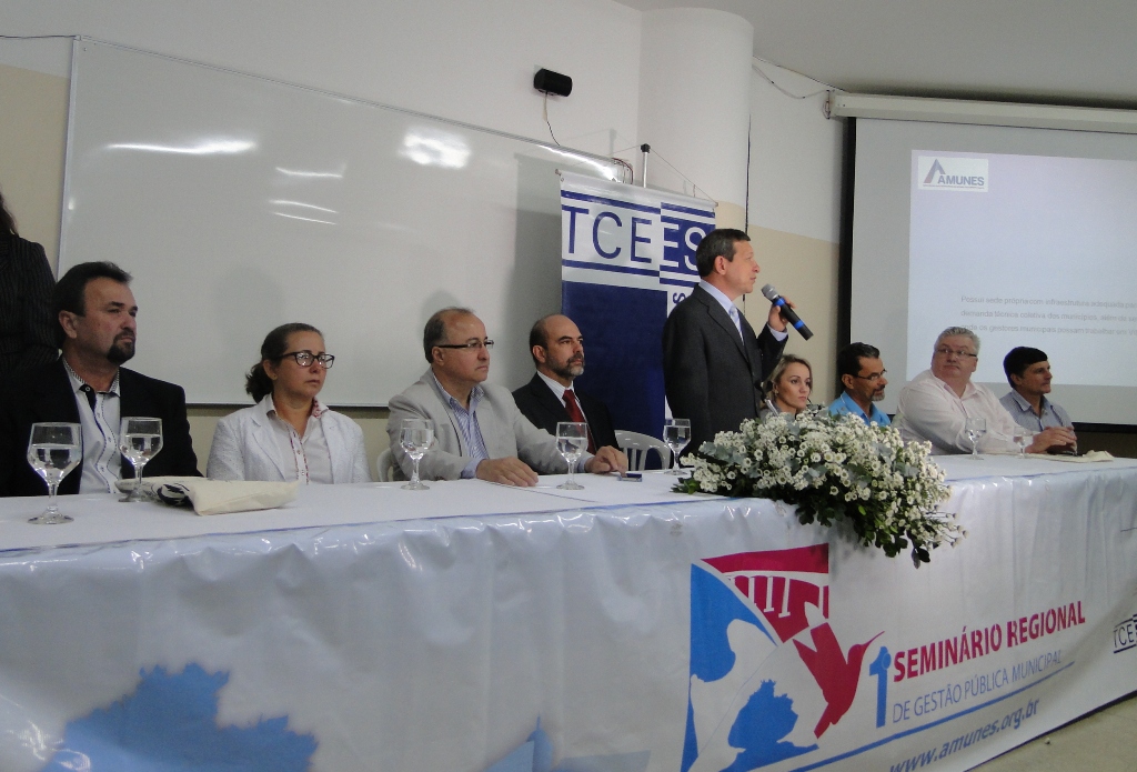 Realizado pela AMUNES – Associação dos Municípios e o Espírito Santo em Ação, em parceria com o TCE-ES, o Seminário Regional de Gestão Pública Municipal reuniu na tarde de ontem (29), Prefeitos, Vice-Prefeitos, Vereadores, Secretários e Servidores Municipais para o debate de temas como execução fiscal nos municípios, regularização fundiária urbana e desafios na gestão pessoal para os setores públicos nestes novos mandatos.\r\n\r\n O evento contou com a apresentação do Prefeito anfitrião e vice presidente da Amunes, Leonardo Deptuski, falando sobre atuação, lutas e conquistas da AMUNES, junto ao governo estadual e federal, em benefício dos municípios.\r\n\r\n O presidente do TCEES, Conselheiro Sebastião Carlos Ranna de Macedo, encerrou o evento, destacando a importância de uma nova forma de se administrar, com mais ética e transparência.\r\n\r\n A programação segue até quinta-feira, com debates e palestras sobre execução fiscal, planejamento das peças orçamentárias, transparência, controle interno, nova contabilidade pública, captação de recursos, Geo-obras, limites de gastos, licitaççes e controle, entre outros temas.\r\n\r\n O 1ª Seminário Regional de Gestão Pública Municipal já aconteceu em nove regiçes, sendo a próxima e última na Região Metropolitana, sediado pelo município de Vitória.\r\n