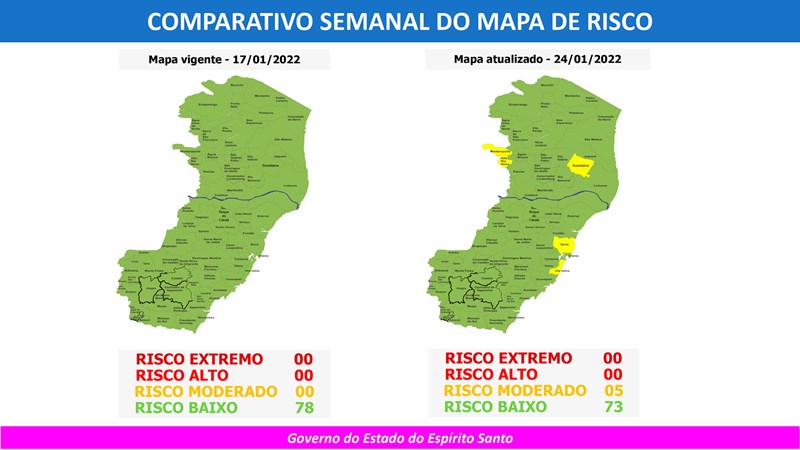 O Governo do Estado anunciou, nesta sexta-feira (21), o 91º Mapa de Risco Covid-19, que terá vigência desta segunda-feira (24) até o próximo domingo (30). Dos 78 municípios capixabas, 73 estão classificados em Risco Baixo e cinco municípios (Alto Rio Novo, Mantenópolis, Serra, Sooretama e Vila Velha) ficarão em Risco Moderado.
