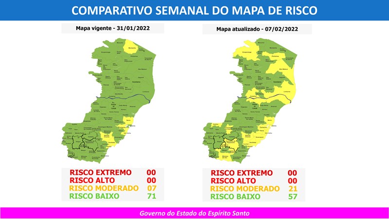 RISCO BAIXO: Afonso Cláudio, Água Doce do Norte, Águia Branca, Alegre, Alto Rio Novo, Apiacá, Aracruz, Baixo Guandu, Barra de São Francisco, Boa Esperança, Bom Jesus do Norte, Brejetuba, Castelo, Conceição da Barra, Divino de São Lourenço, Domingos Martins, Dores do Rio Preto, Fundão, Governador Lindenberg, Guaçuí, Ibiraçu, Ibitirama, Irupi, Itaguaçu, Itapemirim, Itarana, Iúna, Jaguaré, João Neiva, Laranja da Terra, Mantenópolis, Marataízes, Marechal Floriano, Marilândia, Montanha, Mucurici, Muniz Freire, Muqui, Nova Venécia, Pancas, Pedro Canário, Ponto Belo, Presidente Kennedy, Rio Bananal, Rio Novo do Sul, Santa Leopoldina, Santa Maria de Jetibá, Santa Teresa, São Domingos do Norte, São Gabriel da Palha, São José do Calçado, São Roque do Canaã, Sooretama, Vargem Alta, Venda Nova do Imigrante, Vila Pavão e Vila Valério.