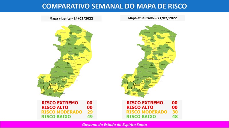O Governo do Estado anunciou, nesta sexta-feira (18), o 95º Mapa de Risco Covid-19, que terá vigência desta segunda-feira (21) até o próximo domingo (27). Dos 78 municípios capixabas, 48 estão classificados em Risco Baixo e 30 municípios ficarão em Risco Moderado. Não há municípios classificados em Risco Alto.