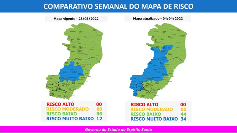 O Governo do Estado anunciou, nesta sexta-feira (1ª), o 101º Mapa de Risco Covid-19, que terá vigência desta segunda-feira (04) até o próximo domingo (10). Em decorrência do avanço na vacinação contra o novo Coronavírus (Covid-19), mais duas microrregiões (Caparaó e Centro-Oeste) passaram a ser classificadas em Risco Muito Baixo. Agora, o Estado tem 44 municípios em Risco Baixo e 34 municípios em Risco Muito Baixo.