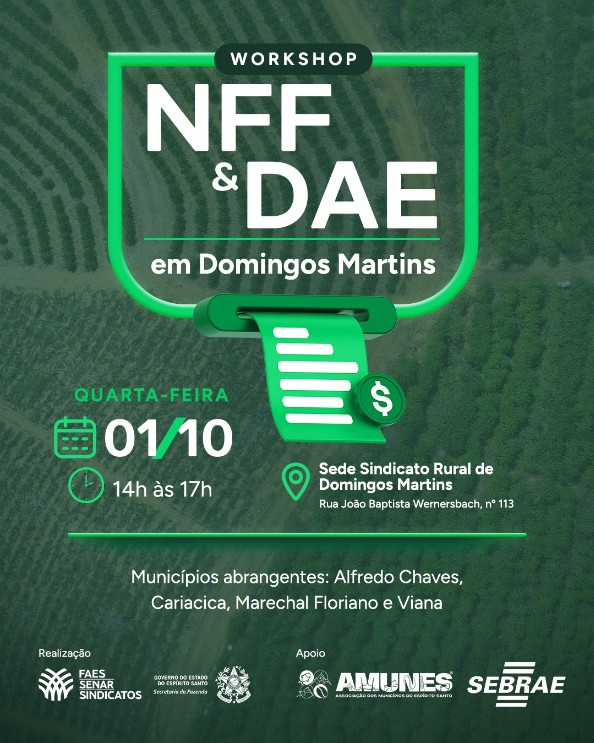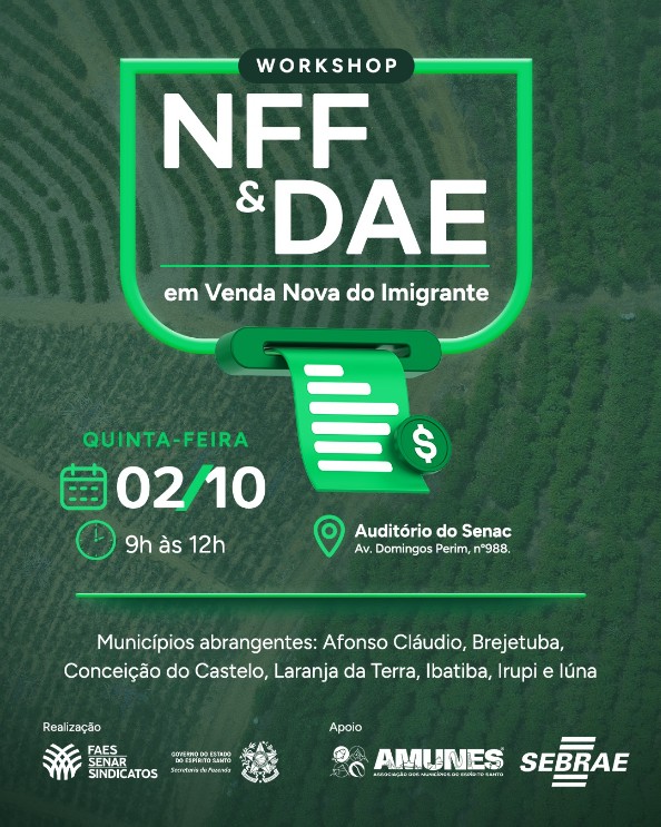 Na próxima semana, acontecem os dois últimos workshops NFF e DAE (Nota Fiscal Fácil e Documento de Arrecadação do eSocial), projeto itinerante que percorreu, nas últimas semanas, diversos municípios capixabas levando capacitação para as regiões. O projeto é uma realização do Sistema Faes / Senar-ES / Sindicatos Rurais, em parceria com a Secretaria de Estado da Fazenda (Sefaz), e apoio da Associação dos Municípios do Espírito Santo (Amunes).