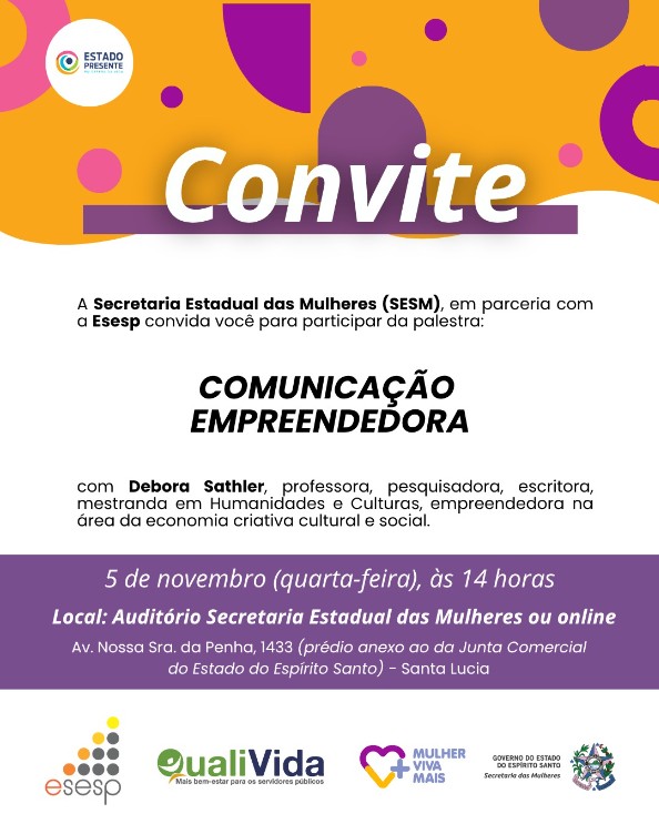 A Secretaria Estadual das Mulheres (SESM) e a Escola de Serviço Público do Espírito Santo (Esesp) vão promover a palestra “Comunicação Empreendedora”. A palestrante convidada é Debora Sathler, professora, pesquisadora, escritora, empreendedora na área da economia criativa, cultural e social e autora de livros sobre identidade, gênero e etnia.