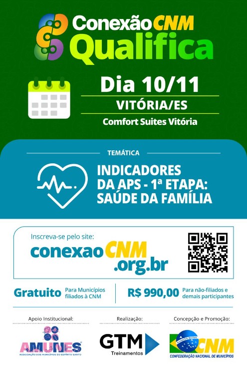 A Confederação Nacional de Municípios (CNM), com o apoio da AMUNES, vai realizar, em Vitória, o “Conexão CNM - Qualifica”, com o curso “Indicadores da APS (Atenção Primária à Saúde)- 1ª etapa: Saúde da Família”. Essa temática é mais uma que será apresentada pela CNM nesse encontro, quando também serão dadas orientações para prestação de contas no primeiro ano de gestão. Saiba mais aqui: Conexão CNM-Qualifica chega a Vitória.