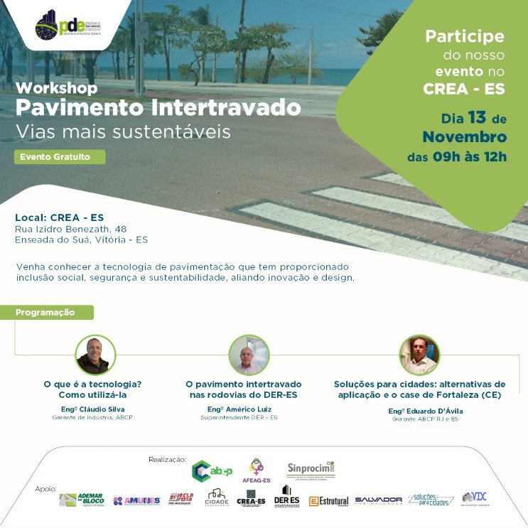 A Associação dos Municípios do Espírito Santo (Amunes) é apoiadora do “Workshop Pavimento Intertravado: Vias mais sustentáveis”, evento promovido pela Associação Brasileira de Cimento Portland (ABCP), Sinprocim-ES (Sindicato das Indústrias de Produtos de Cimento do Estado do Espírito Santo) e AFEAG-ES (Associação Feminina de Engenharia, Agronomia e Geociências do Espírito Santo), com apoio também do Conselho Regional de Engenharia e Agronomia do Estado do Espírito Santo (CREA-ES).