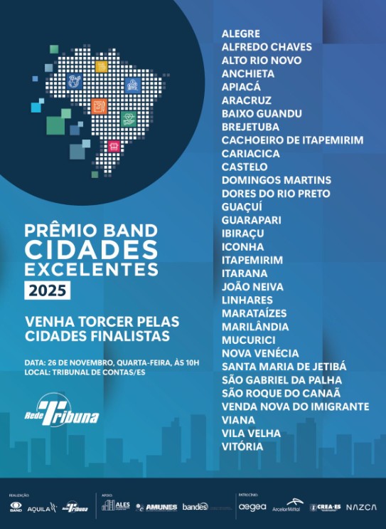 O Grupo Bandeirantes de Comunicação e a Rede Tribuna, com apoio da Associação dos Municípios do Espírito Santo (Amunes), convidam todos os municípios capixabas para torcer e conhecer os grandes vencedores do Prêmio Band Cidades Excelentes 2025.