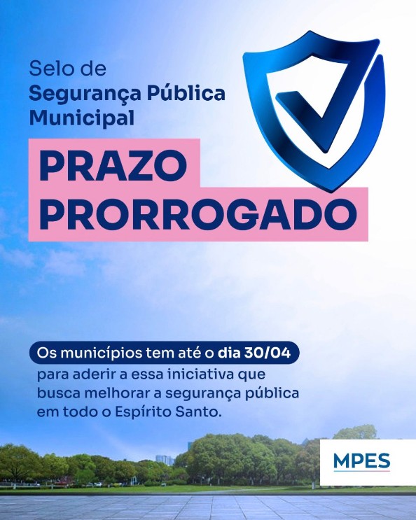 Foram prorrogadas até o dia 30 de abril as inscrições para os municípios interessados em aderirem ao Selo de Segurança Pública Municipal do Ministério Público do ES (MPES). Essa é uma iniciativa que reconhece municípios que estruturam sua governança, capacitam suas equipes, planejam ações e executam projetos de prevenção.