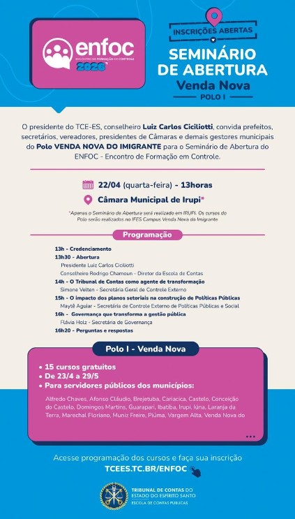 Além disso, estão abertas as inscrições para os cursos do primeiro polo do Enfoc. As atividades serão realizadas no município de Venda Nova do Imigrante, com cursos voltados à capacitação de gestores e servidores públicos municipais. As inscrições são realizadas por meio do site do Enfoc. Clique aqui e faça sua inscrição!